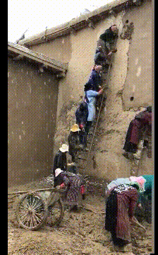 两位干农活的大妈因分不清农田的界线而互相尬舞