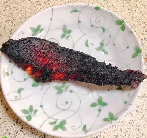 一位网友晒自己姐姐烧的鱼。这是锻造了一把兵器吗?
